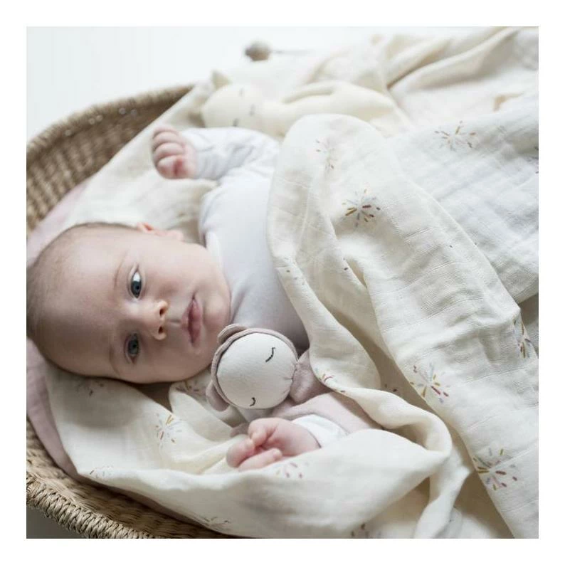 Get inspired by the many uses of our versatile swaddles! These extra-large muslin cloths are ideal to tuck your baby in safely for sleeping, to cover them when nursing or napping, to lay on when changing him/her, or (just) to simply wear as a colourful scarf. Always handy to bring along for a day on the go with your little one. Truly soft and breathable, and above all, 100% organic! This set contains two Swaddles – one in Mauve and one with rainbow colours pattern Material: 100% GOTS certified organic cotton Size: 120 x 120 cm