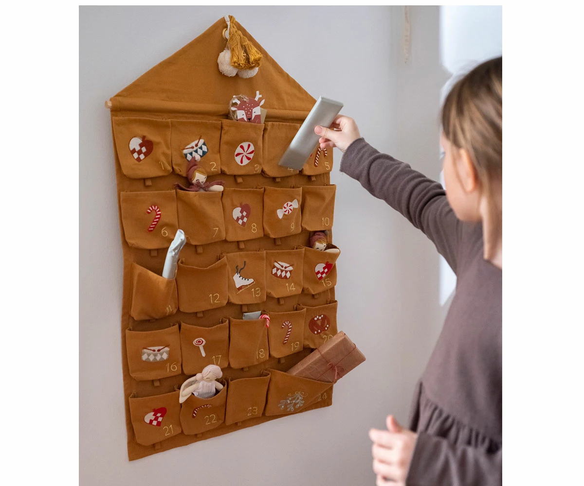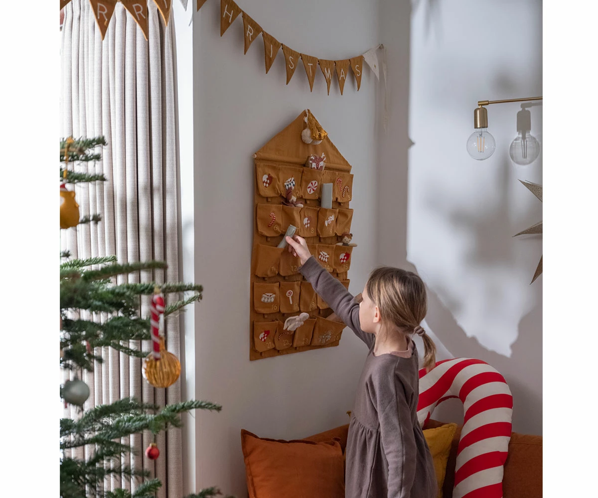 Wall calendar, dotted with nostalgic Christmas figures and decorated with tassels and pompoms, has 24 pockets with little ties to fill with little surprises that make each day special, as we count down to Christmas.