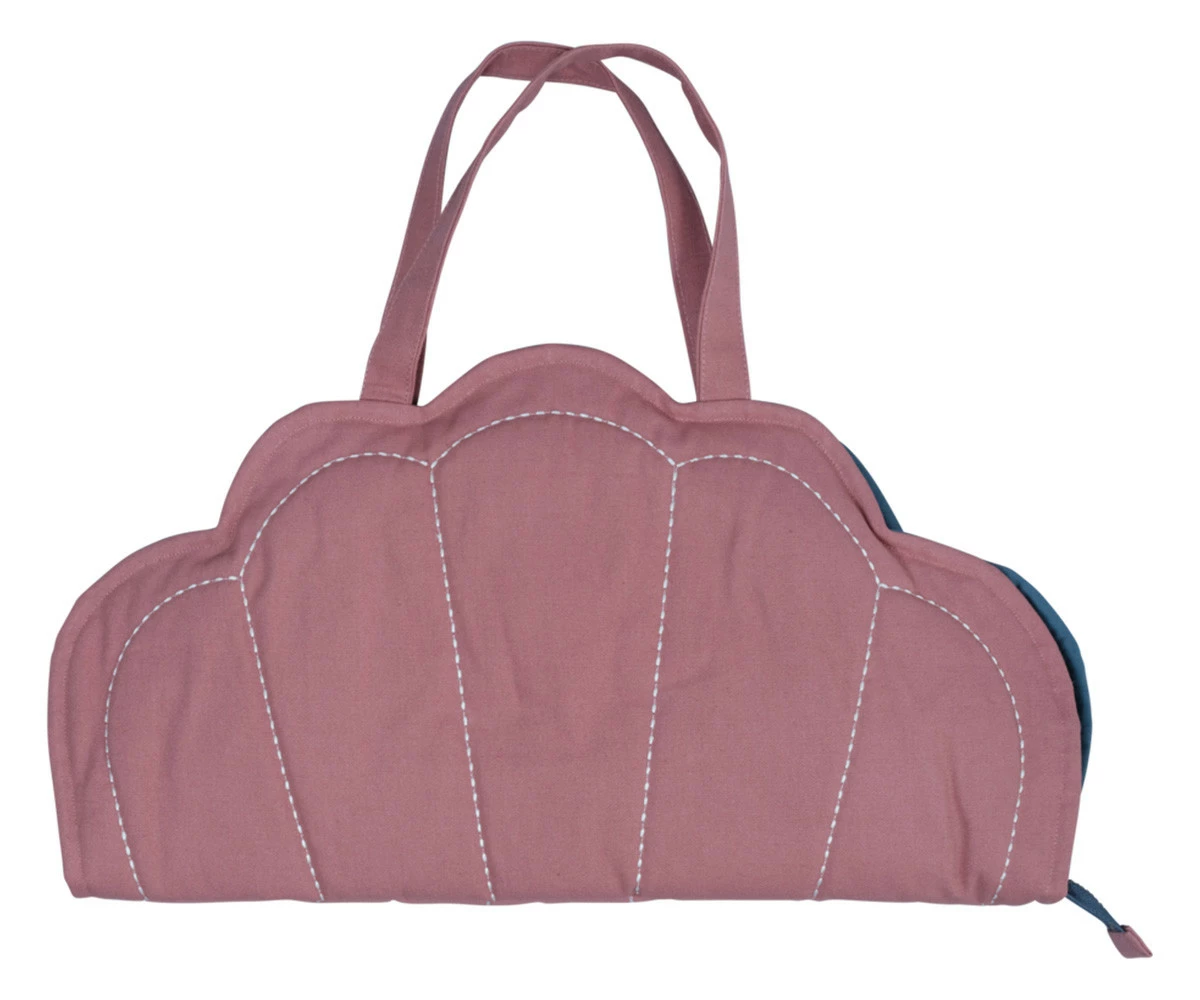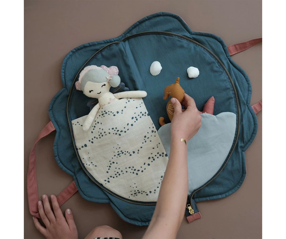 Borsettina a forma di mezzaluna, leggermente imbottita e accessoriata con pupazzini a tema. Quando si apre si converte in un play set su cui animare le avventure delle tue bambole. Composizione: 100% cotone organico certificato GOTS Misure: 42 x 22cm Include 3 piccoli pupazzini a tema Due taschine interne Chiusura a cerniera