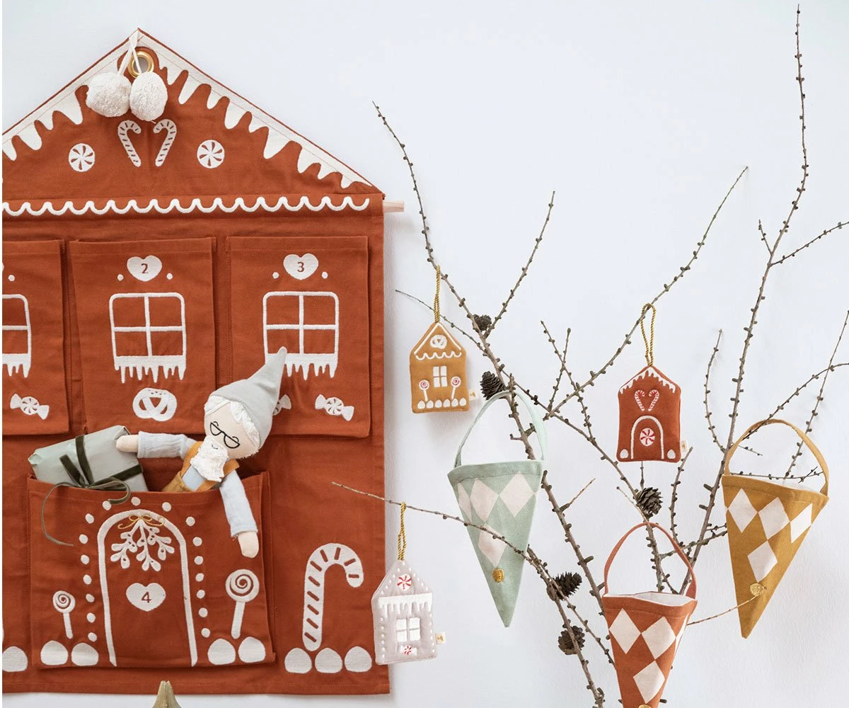 Calendario dell’Avvento – Ocra Dettagli: composizione: 100% cotone organico certificato GOTS ricamato con filo di poliestere misura 68 x 48cm con anello per appendere al muro lavabile in superficie con panno umido disegnato in Danimarca