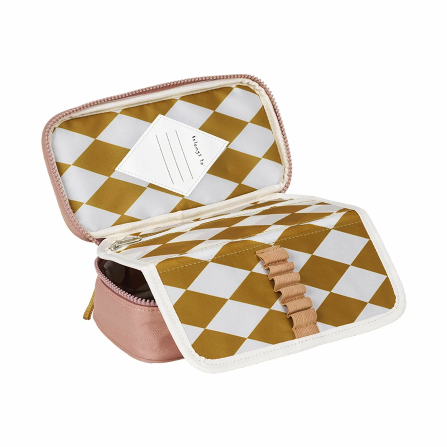 El tejido exterior e interior del estuche están fabricados con poliéster reciclado postconsumo con un bonito estampado de rombos en su interior. El poliéster reciclado postconsumo son botellas de plástico reutilizadas que se limpian, se trituran y se convierten en un hilo que se reutiliza en la producción. Para fabricar este estuche se han utilizado 12 botellas de plástico.
