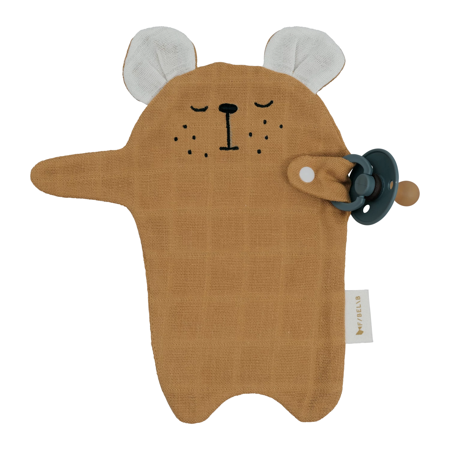 The cutest little Pacificer Cuddle Bear has a hold of your little one’s pacifier and will make sure that he feels safe. When needed, clip off the pacifier from the Bear’s arm and let the baby play and cuddle with the soft Bear. Dimension: 12x21cmComposition: 100% Organic cotton