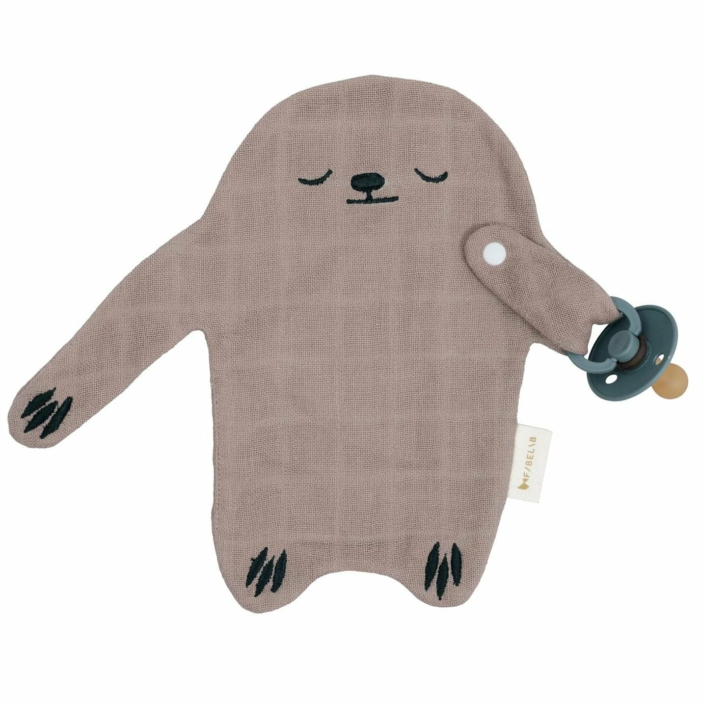The cutest little Pacificer Cuddle Sloth has a hold of your little one’s pacifier and will make sure that he feels safe. When needed, clip off the pacifier from the Sloth’s arm and let the baby play and cuddle with the soft Sloth and his long arms. Dimension: 12x21cmComposition: 100% Organic cotton