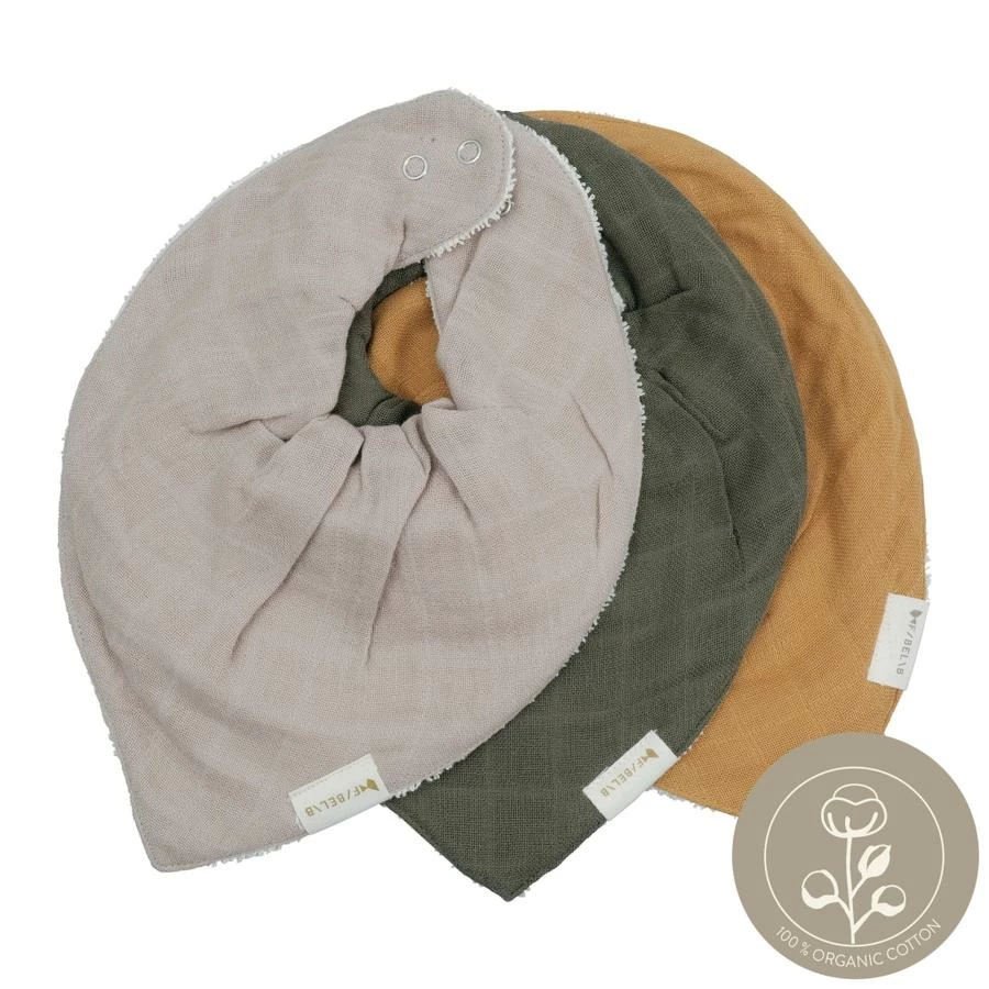 Bandana Bibs, made from 100% organic cotton, in a pack with 3 gorgeous shades of beautiful earthy tones. There are popper buttons for adjusting neckline size. Organic muslin and terry cotton material would allow wiping baby’s face at any time.