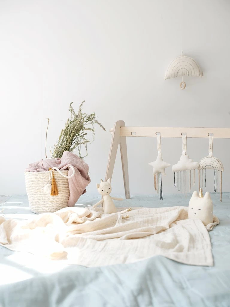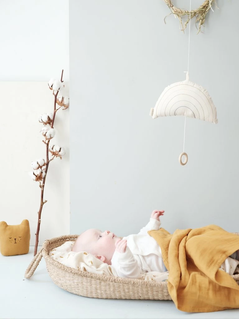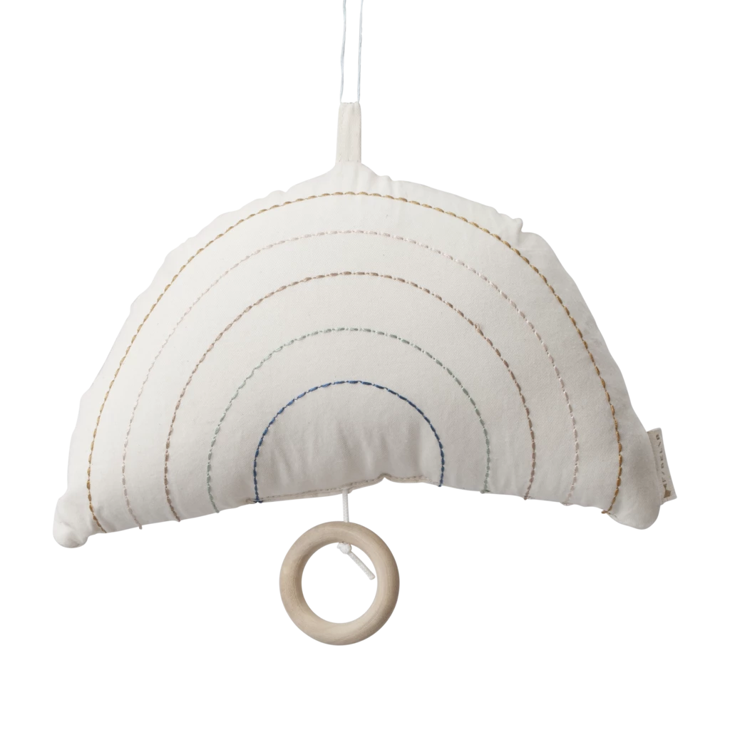 This sweet little musical rainbow plays Brahms’ Lullaby melody when the wooden handle is pulled. Made of soft cotton, it’s a perfect companion for your little one to fall asleep. It can be hung on a buggy or on the ceiling using the loop on top.