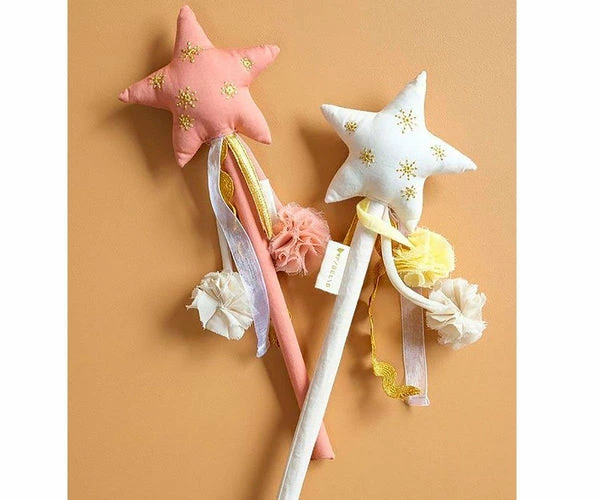 Varita mágica en forma de estrella acolchada y brillante. Dejarán volar su imaginación a través de mundos llenos de hechizos y magia. Exterior: algodón orgánico Relleno: poliester reciclado y madera de pino Medidas: 31 x 11 cm aprox. Limpiar con un paño húmedo